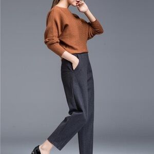 These high-waisted trousers are crafted from a heavier fabric (50/50 wool, polyester blend) in a dark charcoal gray color. They feature a straight wide-leg silhouette that extends elegantly down to the ankles, offering a modern and stylish look. Some elastic in the back of waist. Brand new, never worn. Didn’t care for the way they fit. Size small and they fit my 5’2” frame nicely. From the brand xiaolizi on Etsy.