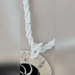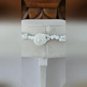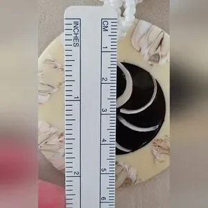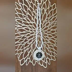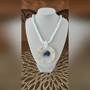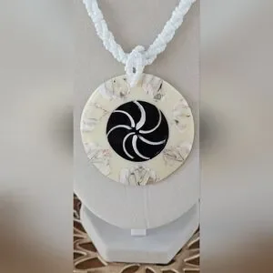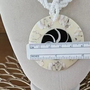This handcrafted necklace features a striking black and white design shell pendant suspended from a 16-inch beaded necklace. The main stone shape is round, with the pendant styled in a unique and artistic manner. The necklace is a stylish piece of artisan jewelry that adds a touch of elegance to any outfit with its sophisticated color scheme and intricate design. Perfect for those who appreciate handpainted details and statement jewelry pieces.