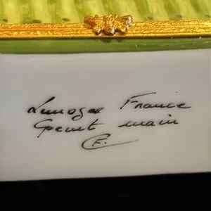 Hand painted (peint main) and initialed by the artist as well as Limoges France peint main is written. Excellent condition. I love the little bee that also shows up on other trinket boxes by Limoges. When open it has a little plant leaf. Vintage. Measurements in pics.