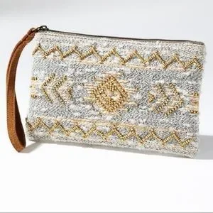 Handmade fine cotton yarn dye jacquard ethnic diamond shape pattern with beads leather wristlet clutch.