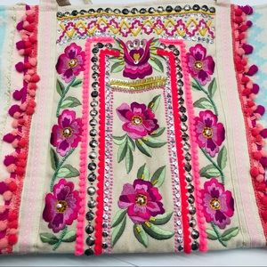 Gorgeous large bohemian tote bag. Exquisite detail was put into this bag. It measures 22” in width 13” in length. Snap closure and interior pockets. The pictures do not do it justice!