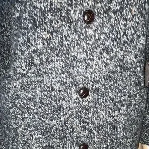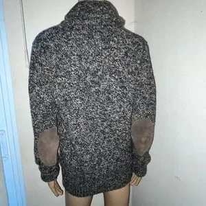 In good pre-loved condition. This is a Vintage 100% wool cardigan with leather buttons and suede elbow patches. .There is a slight flaw. The right elbow patch has a small lighter area on it. (see picture ) its minor but just wanted to note the flaw. 2 front pockets. It is a black and grey marled wool. with a shawl collar. Size S. I think its a good piece for a women as well as its a nicely made sweater that's sure to keep anyone warm. Flat lay measurements are as follows and are approximate.