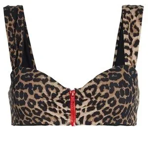 Veronica Beard Balos Zip Front Bikini Top in leopard print, estimated size small. Excellent condition. Vintage-inspired leopard bikini top, sculpted with a sweetheart neckline. Designed with a graphic zip front closure. Ruched through the front. Self lined. 12” underbust.