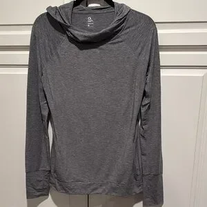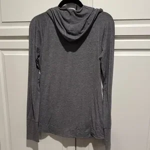 Stylish gray hooded top. Long sleeves for comfort. Perfect for casual wear or for a post workout pullover. Like new top with side pockets and comfy feel.
