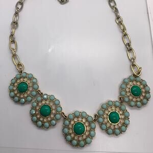 $125 signature statement necklace from J Crew. Teal jewels in a circle with large center jewel on a chain with large links.
