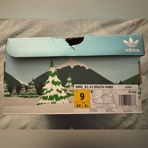 This is a brand new pair of adidas NMD R1 sneakers in a design inspired by South Park's character Professor Chaos. They are men's athletic shoes in size 9, featuring a sneaker style. The shoes are branded by adidas and are not considered vintage.