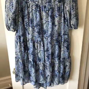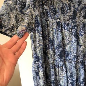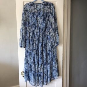 Beautiful paisley print tiered maxi dress. Longer in the back. Flowy, sheer sleeves and hemline.