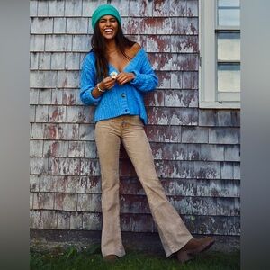 NWT American Eagle Stretch Corduroy Super High-Waisted Exposed Button Fly Flare Pant in Field Khaki, Size 14 Regular Length (Large). Belt loops, stylized front pockets, and back pockets.