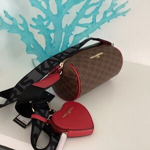 NWT KARL LAGERFELD CROSSBODY BROWN LOGO BAG W RED HEART COIN PURSE