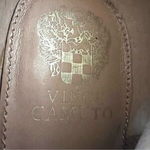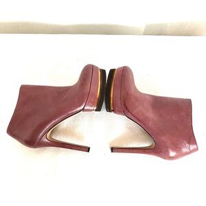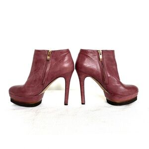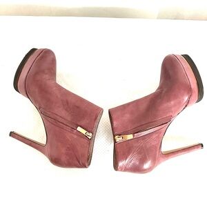 Vince Camuto magenta leather high heel platform booties in good used condition. Some marks on heels. Normal wear.Zipp up high heel booties.Buttery soft leather with gold accent. My shoemaker has added half an inch on the platform for extra comfort.Please review all pictures zoom in & ask any questions.