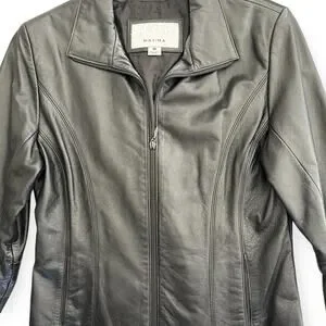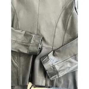 Vintage Wilsons Leather Maxima black zip up leather jacket in a fitted moto biker style. Size M. This jacket is in great preowned condition. There is one small section of a back top stitching seam that is coming out. It's about 1/2 inch long.
