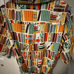 Flattering shirt dress with a vibrant retro book print. Perfect for lit ladies.