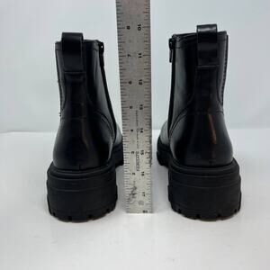 House of Harlow Women's Righteous Leather Chelsea Boots. Tagged women's size 8. Black leather. In good preowned condition with minimal signs of wear. Small scuff on the left shoe (as pictured). Chunky, lug sole boots with a 2 inch heel. All zippers are functional.