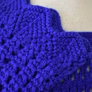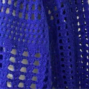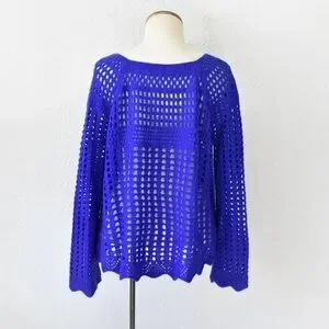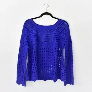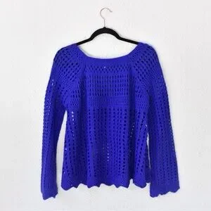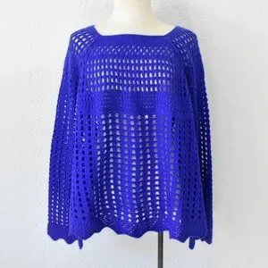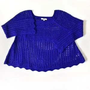 Vibrant royal blue crochet sweater. Swing shape with scalloped hems. Squared neckline. 60% cotton; 40% acrylic.