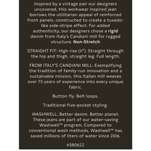 Inspired by a vintage pair the designers discovered — but with a suede-like velvet finish — this workwear inspired, flocked jean borrows the utilitarian appeal of reinforced front panels, constructed to create a tuxedo-like side-stripe effect.