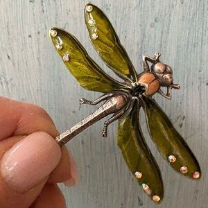 Pretty green enamel dragonfly pin with rhinestones on its wing tips giving it lots if sparkle. It has a peach-colored body, silver tail, and big silver eyes. The dragonfly measures 2” long with a wingspan of 2-1/2.”