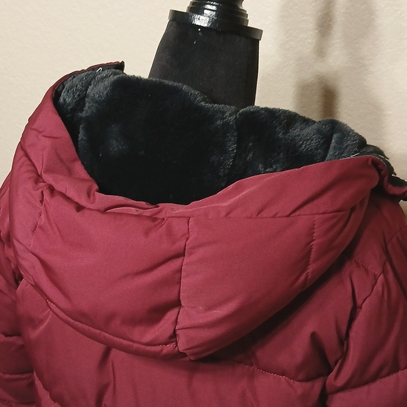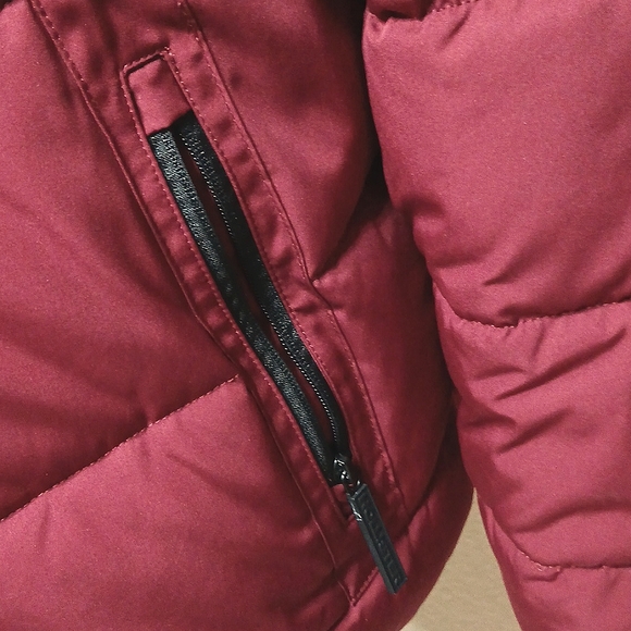 HOLLISTER MEN'S PUFFER JACKET--In a beautiful Burgundy color in all weather 100% polyester with the entire interior liner in faux-fur including the inside of the hood