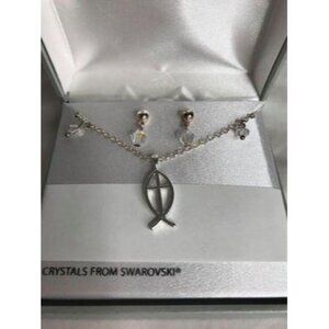 Swarovski Crystals ichthys religious fish cross necklace and earrings set -