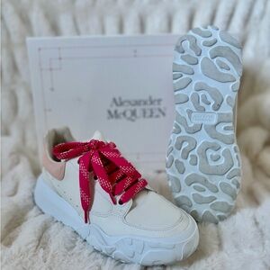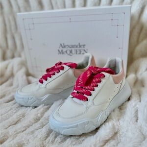 Gorgeous white and pink McQueen women’s sneaker. Fits TTS. Round toe with lace up pink laces. AM logo on tongue and heel with a Pink contrast suede heel counter. Oversized rubber sole with leather upper & leather lining. Worn only once.