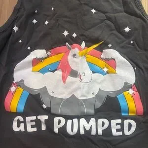 This fun gray tank top is great for all climbers. The front says “Get Pumped” and has a picture of a unicorn flexing its muscles. Behind that, is a rainbow, with only the pink, yellow, and blue.