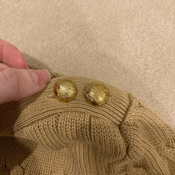 Beautiful carmel colored cable knit sweater from Ralph Lauren. It’s a bit of a boat neck style. Gold hard wear and detailing. This item is used but shows no visible signs of wear