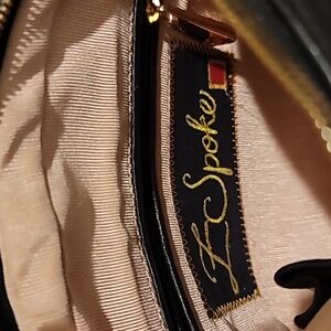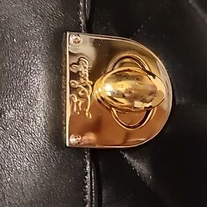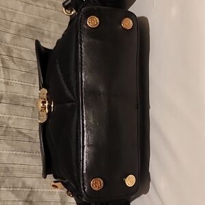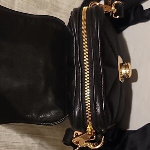 This elegant black bag has a quilted satin exterior with bows on the sides. It's closing flap is made of soft black leather with gold-tone hardware and includes the Z Spoke logo clasp.