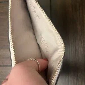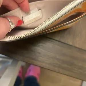 Holds cell phone , lip gloss , keys etc. included is an adjustable strap. Slight spot on bag and it is included in photos. Mainly in brand new perfect condition.