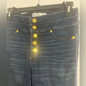 High rise super skinny jeans in dark indigo wash. Gold button front closure. Double waistband detail. Size 28 (6). Made with elastin for stretch. Gently worn and in great condition.