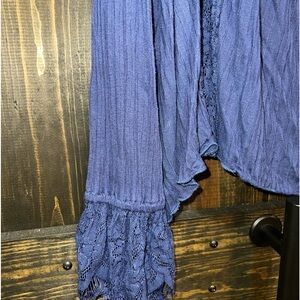 Free People brand Georgia Lace top. Size medium. Navy blue. Super feminine. Boho style. Button front. Semi-sheer. Beautiful lace flared hem sleeves. Tunic top. Perfect for layering. Preloved. Please see all photos for condition.