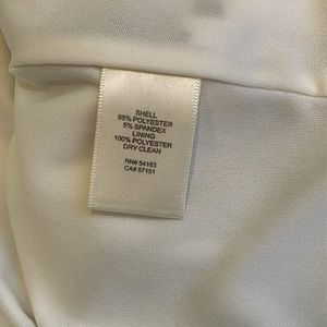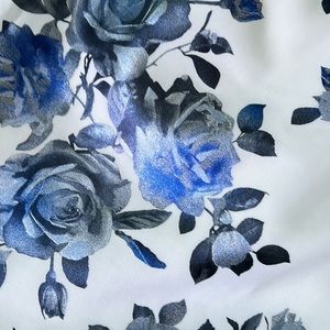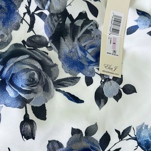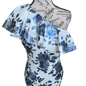 Beautiful Eliza J dress, one shoulder style, floral metallic print, changes colors based on lighting, asymmetrical popover ruffle top, stretchy fabric, lined, side zipper, new with tag. Color white with blue gray print.