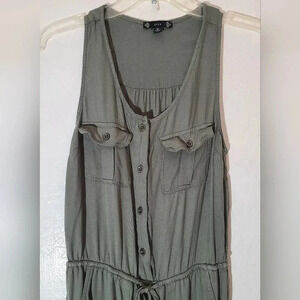Olive green jumpsuit with a drawstring waist and elastic jogger style leg hem.