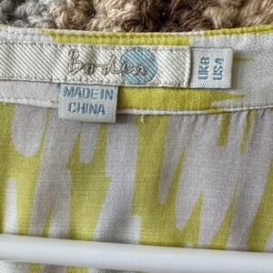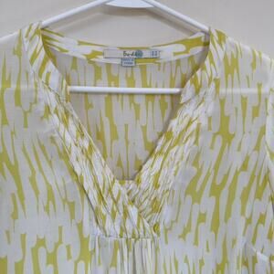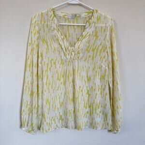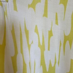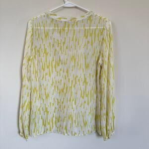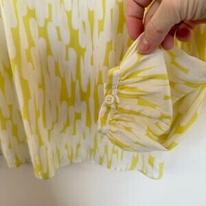 Gorgeous Boden silk and viscose blend blouse features a pretty ruffle collar, long flowy sleeves with button closure at the wrist. Yellow and white abstract pattern.