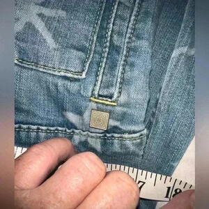 One of a kind custom screen print transfer on a XS palm tree and star Jenny trucker jacket! Such a great combo! Stretchy jacket .. 98%cotton, 2% spandex. Great comfort and ease of movement! Pit to pit 18” , length 20” .