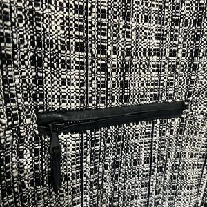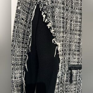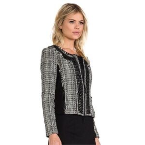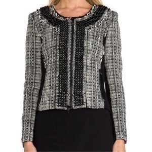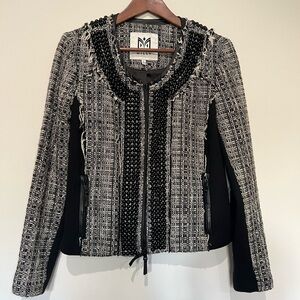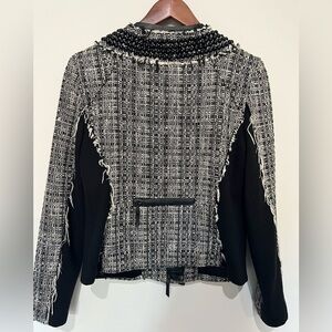 MILLY amazing jacket size 8. Black and white tweed with leather trim. Beaded front with fringe details.