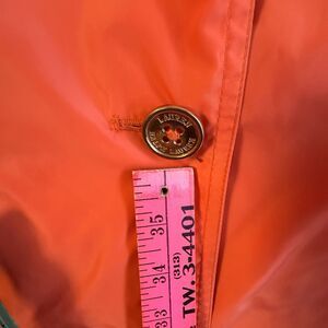 This is a women’s travel rain resistant, windbreaker by Lauren Ralph Lauren in a women’s size XL in a great bright, whimsical fun color of orange. There are 2 tiny marks (see pics)…very teeny and could probably be gotten out with a little time and elbow grease.