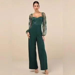Dark emerald green Lulus jumpsuit with sheer puffy sleeves. Worn once for a holiday party. Size large. Some small threat pulls in legs, see photo for reference.