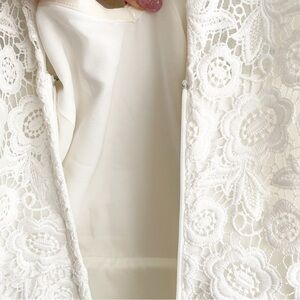 In excellent condition with no visible flaws or signs of wear. White lace dress with large keyhole back, lined dress with multi layer skirt. Altered V Neck neckline