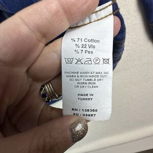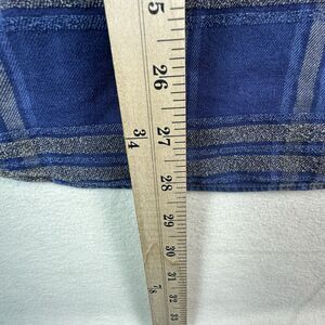 This is a men's size large 32 Bar Blues long sleeve button-down shirt in a multicolor blue plaid pattern. It features a collared neckline with a button-down collar style and button accents. Made of a knit fabric blend of polyester, viscose, and cotton, this shirt is suitable for all seasons and easy to care for with machine washable instructions. The design is classic and preppy, perfect for casual occasions during the summer, fall, and spring.