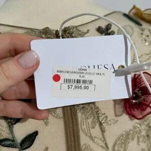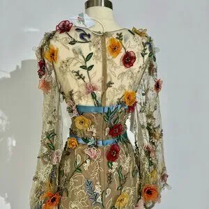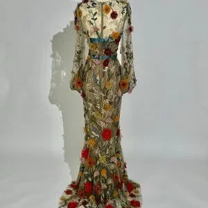 Experience the epitome of luxury with this exquisite Marchesa evening gown. Crafted from the finest silk organza, this gown is fully embroidered with intricate multicolor 3D organza flowers, creating a stunning, dimensional effect. The scoop V-neckline adds a touch of elegance, while the silk ribbon around the bodice accentuates the waist, creating a flattering silhouette. Perfect for red carpet events or glamorous evenings, this gown is a true masterpiece.