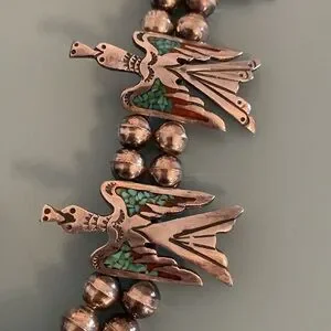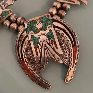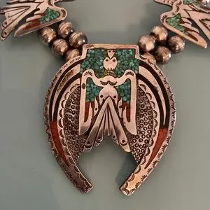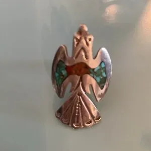 Vintage Oklahoma 1970 Native American Sterling Turquoise and Coral Chip Inlay Zuni Thunderbird Squash Blossom Style Necklace, and Ring. Bracelet has large genuine turquoise stone. Ring size 7. All 3 pieces sold as a set.