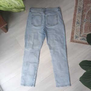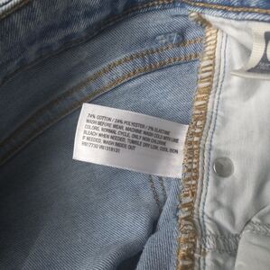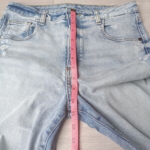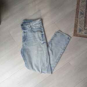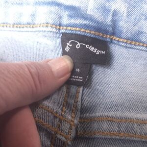 Art Class Girls Hi-Rise Baggy Distressed Jeans. Light wash. 5 pockets (3 in front, 2 in back). Adjustable waistband. Button and zip fly with all hardware intact and functional. Made in a Fair Trade Certified Factory. Minor signs of wear. No rips or stains. Excellent preowned condition.