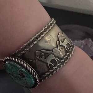 Sterling silver and royston turquoise cuff bracelet. 5.25 inches tip to tip with a 1.25 inch gap, making it best for medium wrists. Made by Appaloosa Designs.