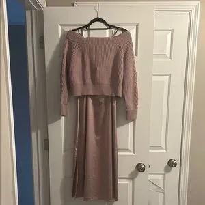 Stylish off-shoulder sweater dress. Cozy knit top with a flowing skirt. Perfect for any occasion.