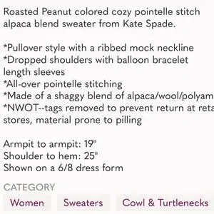 NWOT KATE SPADE Cozy Pointelle Alpaca Sweater, M