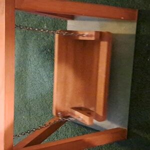 Charming miniature swing chair. Perfect for dollhouses or decor. Made of wood with metal chains. 11.5"×8" (measurements of base)