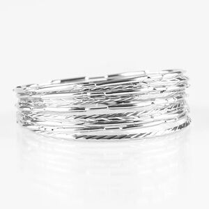 ❤️🔥5/$25❤️🔥 Featuring smooth, serrated, and pinched finishes, mismatched silver bangles stack across the wrist for a bold industrial look.