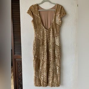 Dress the Population Gold Sequin Mesh Fitted Midi Dress Metallic Large Sparkle