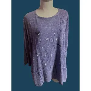This brand new with tags (NWT) Jess and Jane purple tunic features a bird print, dolman sleeves, and pockets. Made from breathable gauze fabric, it offers a comfortable fit in size XL.
