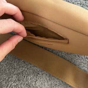 One tiny dot stain on front. Looks bigger cause wet/tried getting it out. Neoprene fabric. Thicker material. Adjustable strap. 2 outside compartments and one inside with clip inside. Great condition and loved but do not need. Comes with original protection bag.