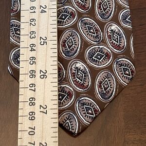 Elevate your style with this vintage Fendi Roma silk neck tie. Made in Italy, this designer tie features a striking geometric pattern in multicolor and a classic width. The tie is short in length, making it perfect for any occasion.